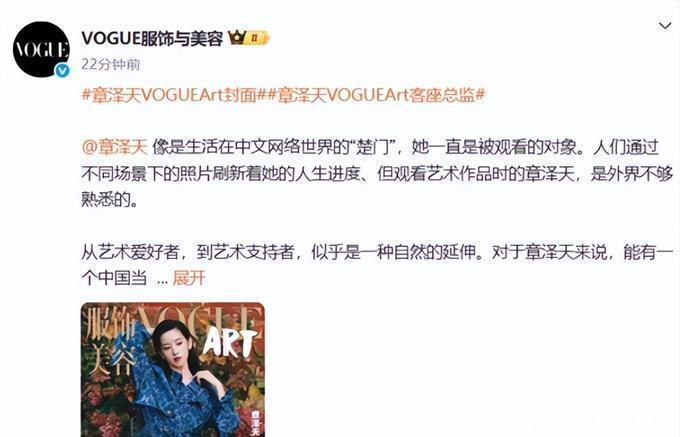 11月12日,Vogue的正式官员宣布章泽天将担任客座总监的职务,并计划在11月的杂志封面上亮相。Vogue作为时尚界的象征,这条消息迅速吸引了众多人的目光和关注,之前登上杂志封面的大多是国际顶级模特或知名艺术家,章泽天的跨界展示确实出乎众人的预料。